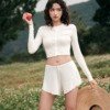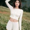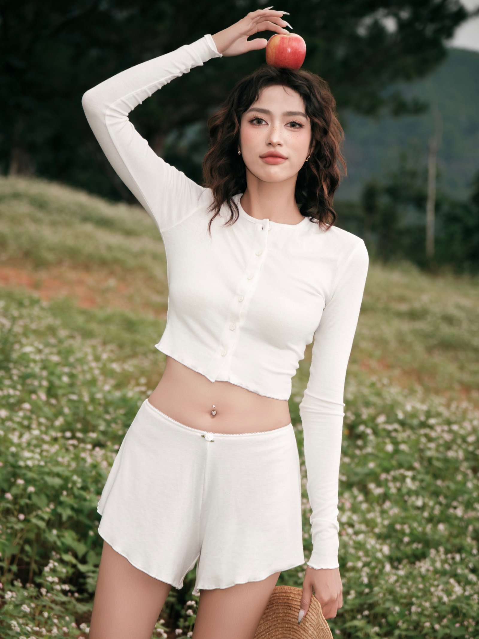 Áo: Áo thun dài tay dáng croptop, điểm xuyết hàng cúc thủ công tinh xảo – một chi tiết nhỏ nhưng gợi mở sự nữ tính và nét thanh lịch nhẹ nhàng.